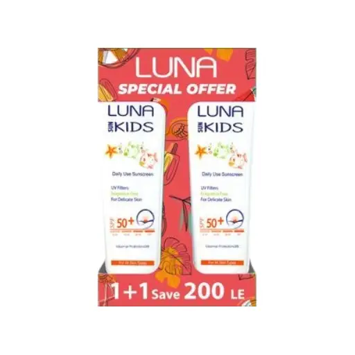 Luna Sun Kids SPF 50+ is a high-protection sunscreen designed specifically for children’s delicate skin. It provides broad-spectrum UVA and UVB protection, helping to prevent sunburn and long-term sun damage. The formula is gentle, water-resistant, and suitable for daily use during outdoor activities. This offer includes 2 bottles for the price of 1, saving 200 EGP.