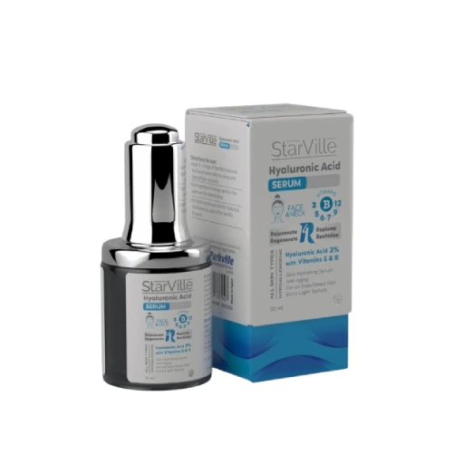 Star Ville Hyaluronic Acid Serum is a deeply hydrating formula designed to boost skin moisture, smooth fine lines, and improve overall skin texture. Lightweight and fast-absorbing, it penetrates deep into the skin to restore hydration and enhance your natural glow — suitable for all skin types.
